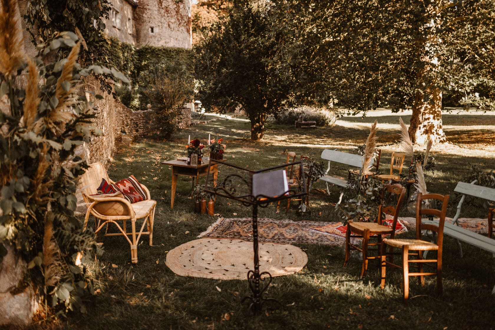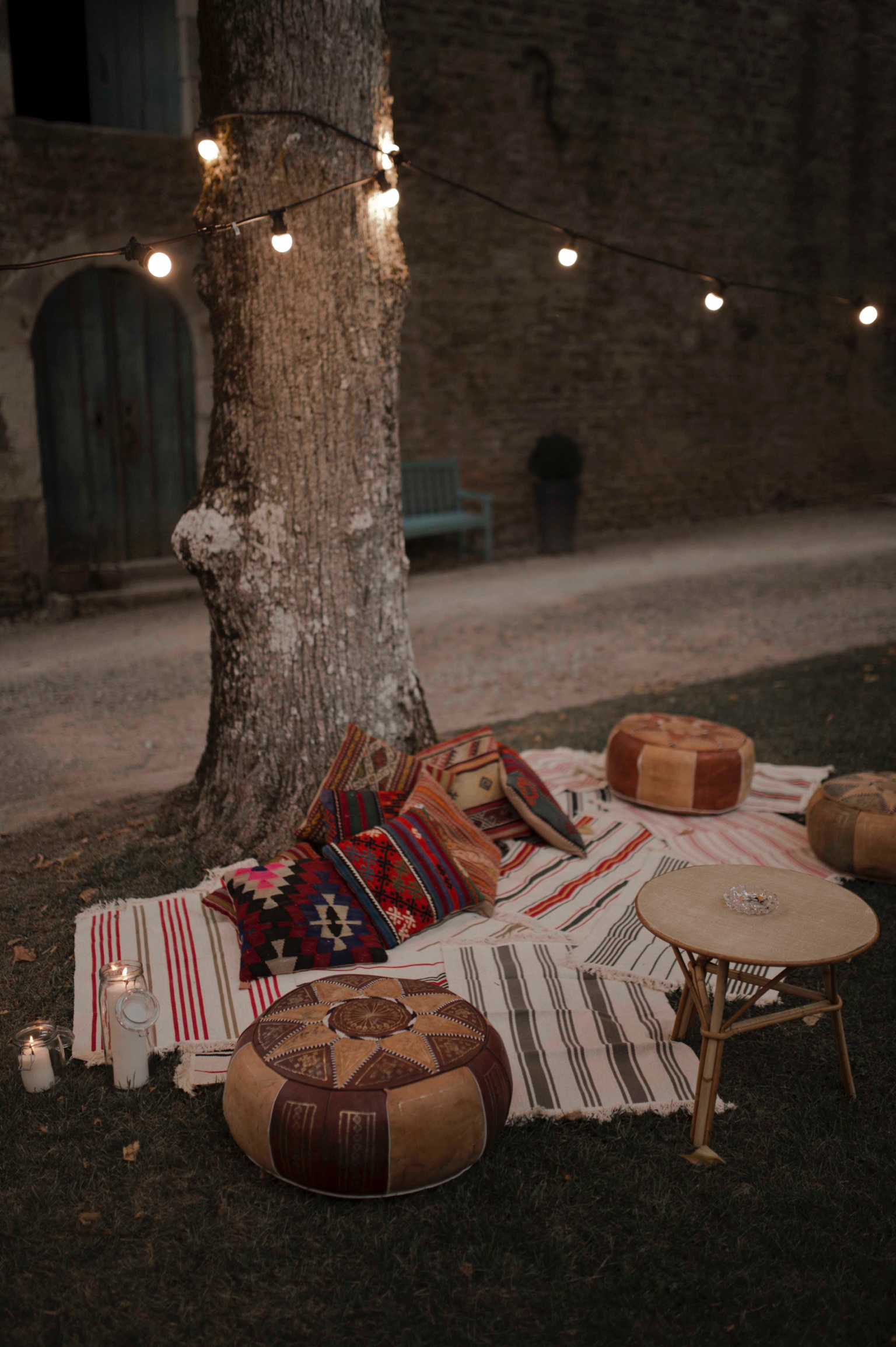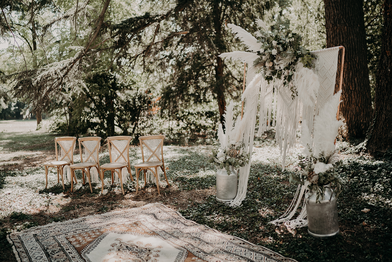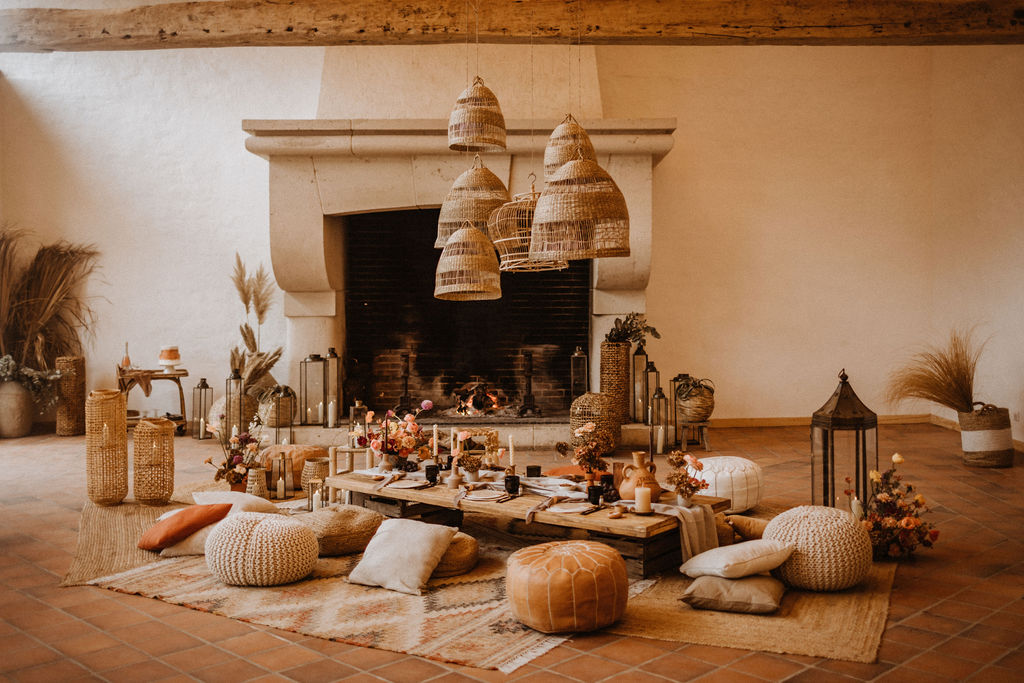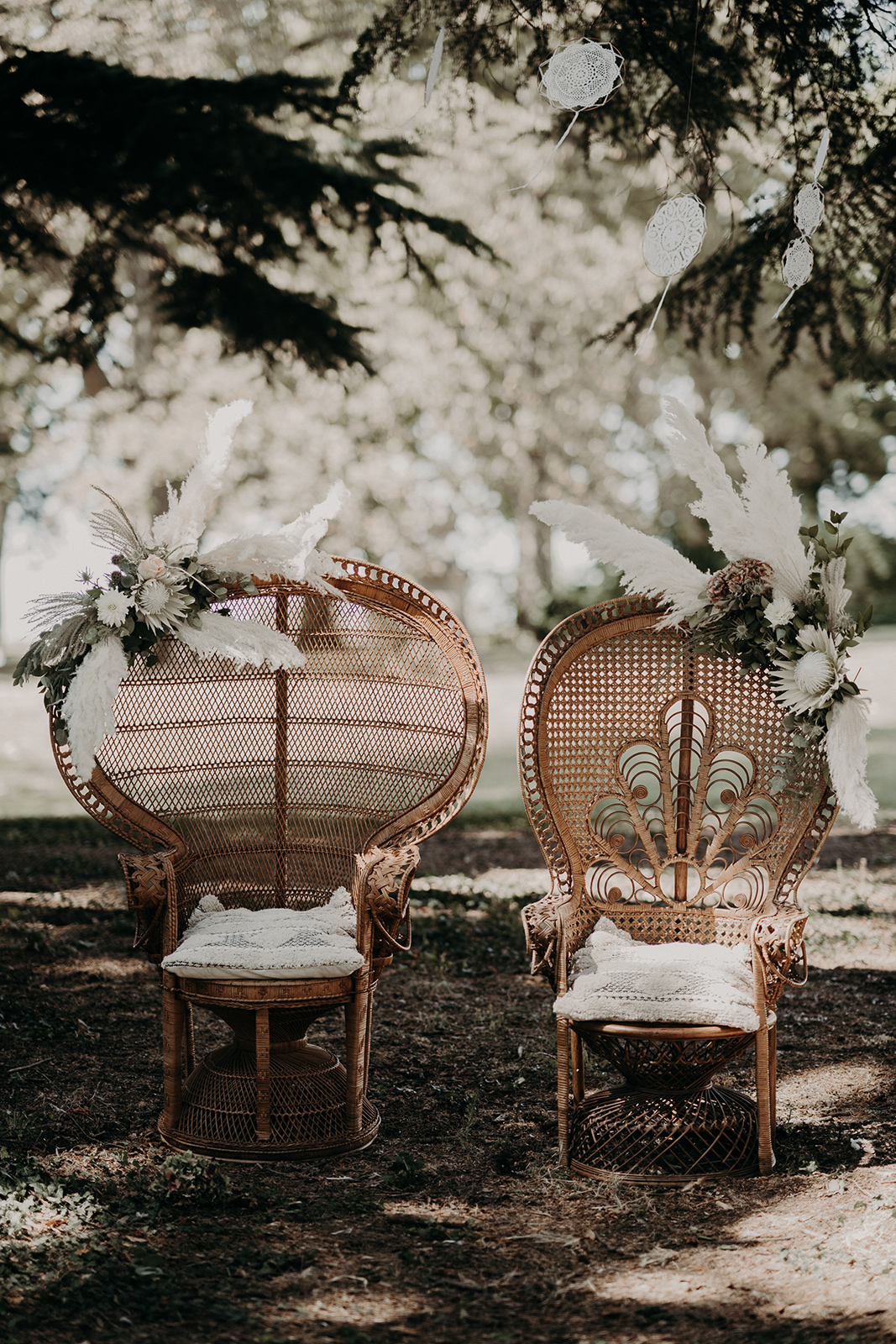 Le must-have de cette décoration ce n’est autre le mobilier en rotin léger et facile à emporter dans son Van et la dame jeanne joliment accompagné de son herbe de pampa !