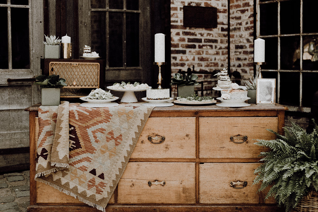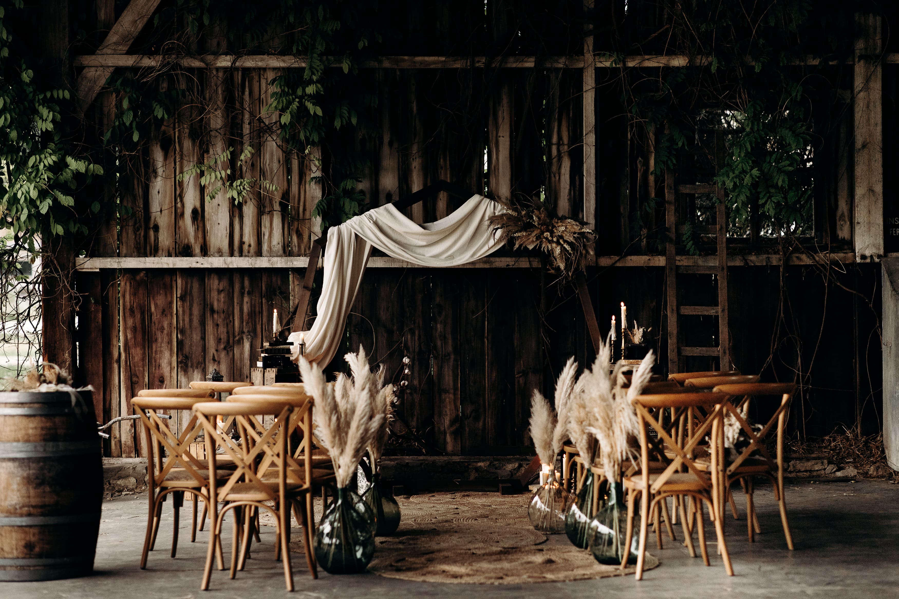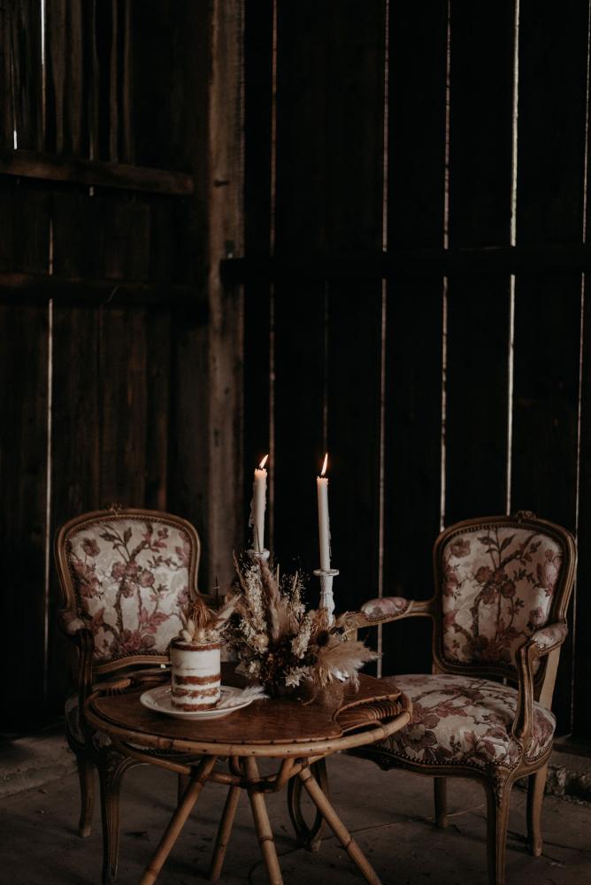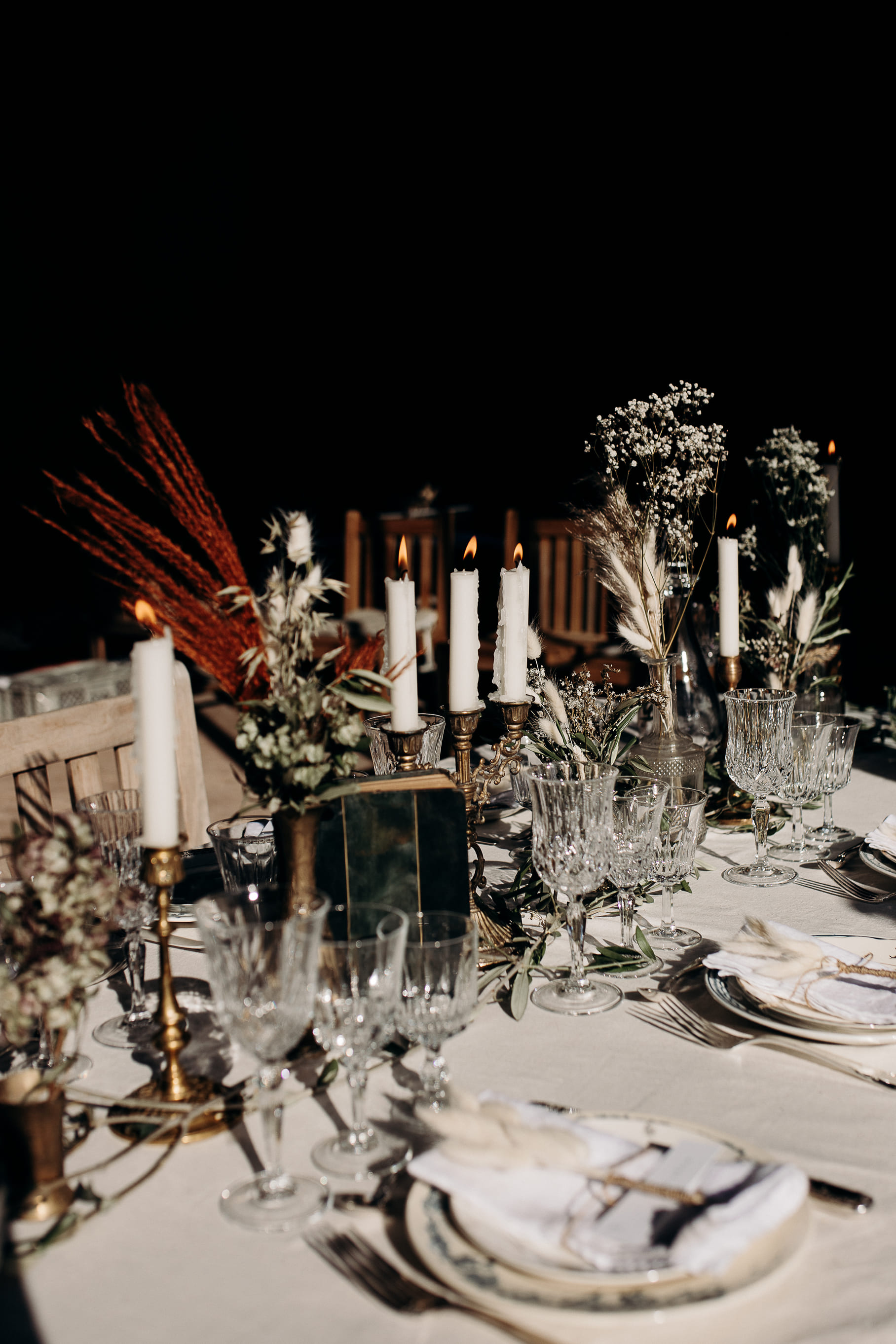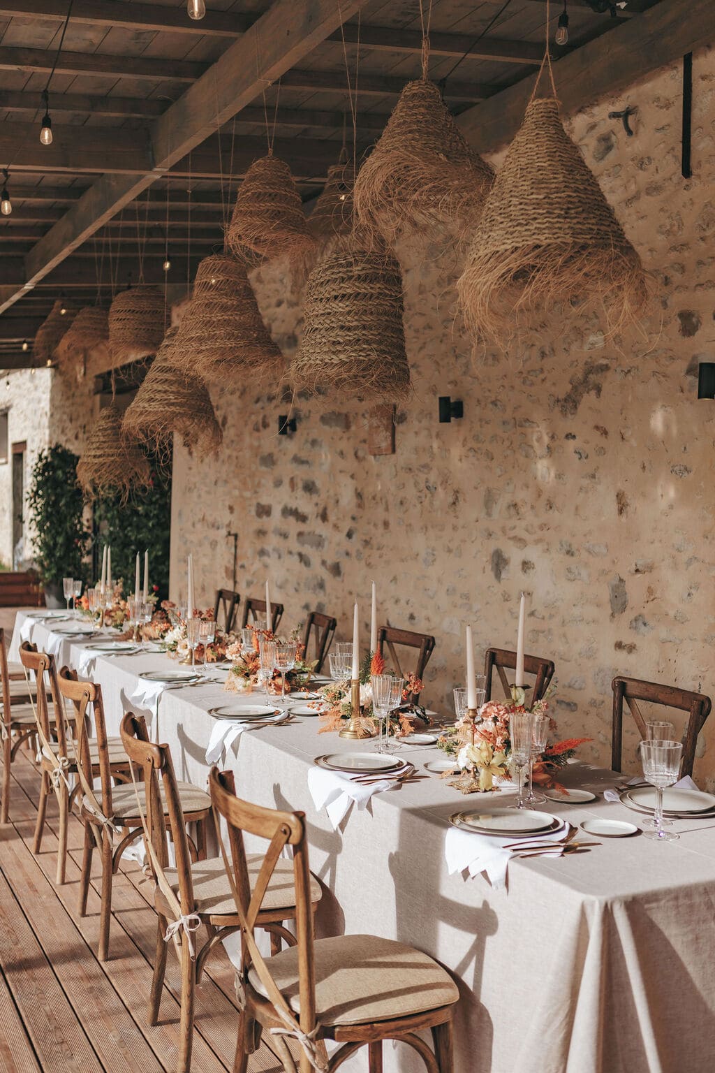 Le must-have de cette décoration ce n’est autre le mobilier en rotin léger et facile à emporter dans son Van et la dame jeanne joliment accompagné de son herbe de pampa !